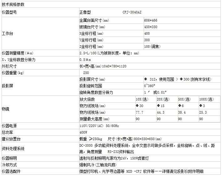 CPJ-3040AZ数字式测量投影仪(正像)整机质量优良,性能稳定。仪器配有脚踏开关和多功能数据处理表DC-3000,数据输出和采样十分方便,使测量更快捷,效率更高。